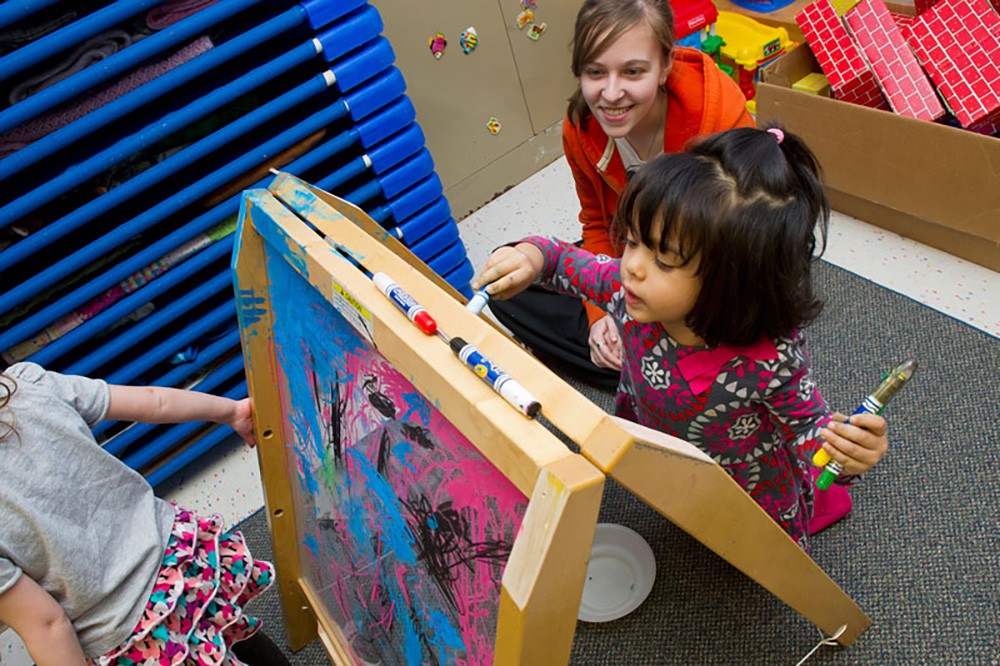 RITâs Engineering House has inventive solutions for older cribs at Margaretâs House that no longer meet federal requirements. Instead of using them as kindling, students repurposed them as easels for classrooms. Here, 3-year-old Aditi Jagannath draws with first-year engineering student Linzey Miller. Other future projects for the crib parts are gates and shelves. -