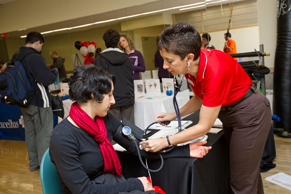 The Better Me Wellness Fair took place in the Global Village Wellness Center on Oct. 10. Exhibitors included Peace Partners, Breast Cancer Coalition, Excellus, RIT Dining Services and Workplace Ergonomics. Here, Michelle Seger, of Government and Community Relations, has her blood pressure checked by Susan Grace, of Wellness Coaches USA.