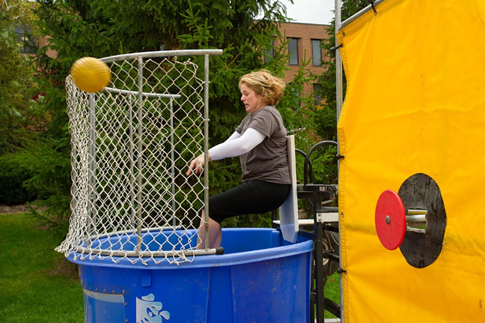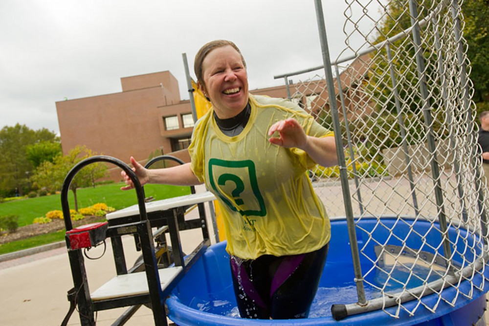 Faculty and staff members from the College of Imaging Arts and Sciences were the target of gallons of fun! They volunteered to be on the hot seat in a dunking booth set up outside of Gannett Hall. For $5, people had three chances to try and get them wet. The money raised will help pay for student travel to RITâs 28th Big Shot next year. The site is not confirmed yet, but more details are expected to be announced soon. Here, Nanette Salvaggio, lecturer in the College of Imaging Arts and Sciences, gets wet. -