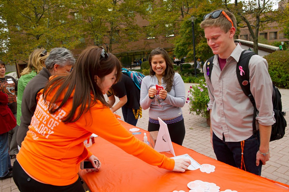 The Fund for RIT kicked off its annual giving campaign on ROAR Day, the seventh annual Raise Our Annual Responses initiative, on Oct. 18. Camila Gomez Serrano, center, and Christopher Haluszczak, left, both second-year Kate Gleason College of Engineering students, make donations. -