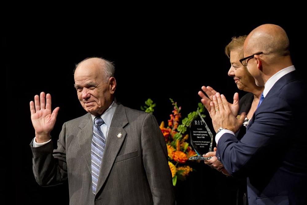 RITâs cooperative education program, which kicked off in 1912 with 32 students at a dozen local companies, turns 100 years old this academic year. A celebration was held Oct. 18 recognizing past achievements and the important role co-op had on the success of RIT graduates. Here, Salvatore Di Schino â36 (mechanical engineering) accepts an award during the ceremony. -