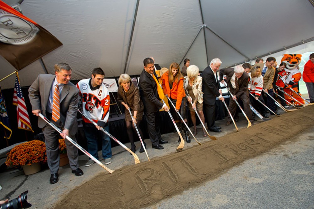 RIT leaders and dignitaries participated in a ceremonial groundbreaking Oct. 19 for the future Gene Polisseni Center. The arena will be the home of the menâs and womenâs hockey teams and is expected to be open for play in fall 2014. -