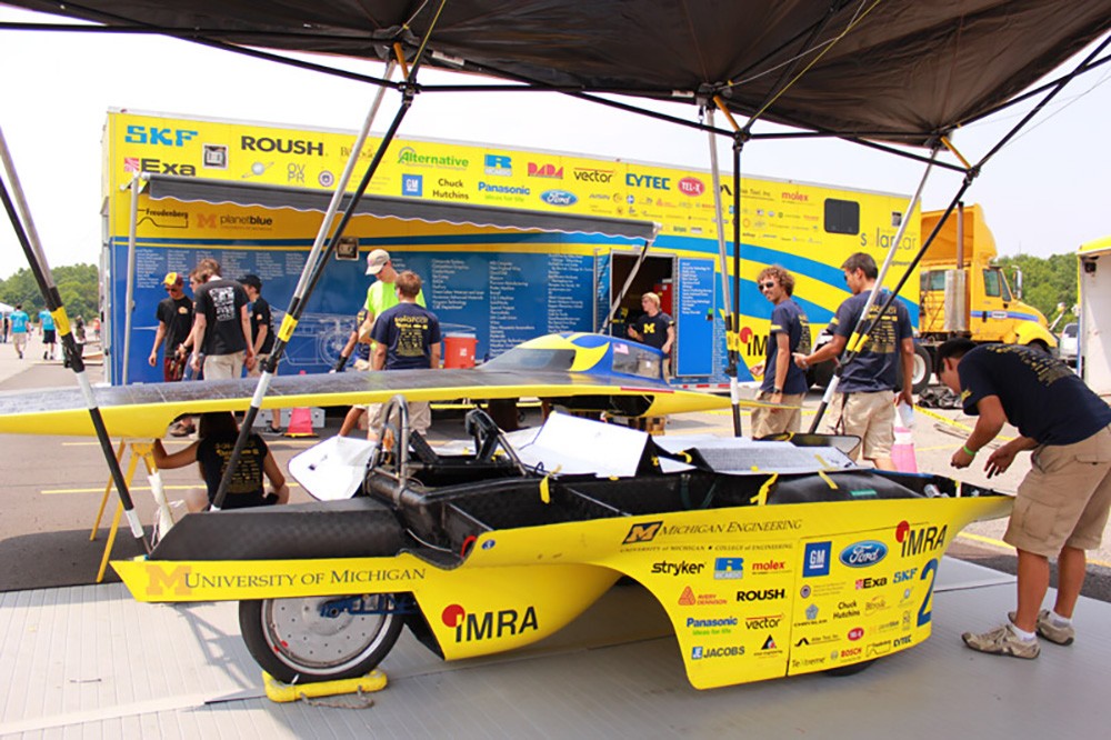 Members of the University of Michiganâs solar-car team inspect one of their vehicles in preparation for the 2012 American Solar Challenge, âEight States in Eight Days.â The collegiate design competition and race, featuring a 1,600-mile route bordering the Great Lakes, launched from RIT. For the full story, go to American Solar Car Challenge Launches âEight States in Eight Daysâ Race. -