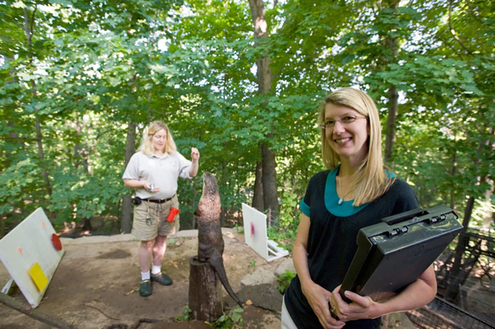 Caroline DeLong, RIT assistant professor of psychology in the College of Liberal Arts, works with Catina Wright, a zookeeper at Rochesterâs Seneca Park Zoo, to study object perception in river otters. DeLongâs research in this area began with marine mammalsânamely dolphins and whalesâand now involves other aquatic animals including goldfish and otters. -