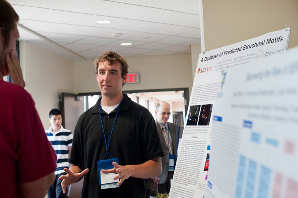 RITâs fourth annual Graduate Research and Creativity Symposium evolved into a regional symposium this year. Graduate students from RITâs nine colleges along with students from University of Rochester, Nazareth College, University at Buffalo and Syracuse University presented their research on July 17. In addition to the oral presentations, there were poster and interactive presentations. Here, RIT student Alexander Grier presents his poster, âA Database of Predicted Structural Motifs.â -