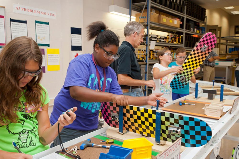 Campers learned about the different parts and processes needed to build a skateboard as part of the Everyday Engineering Camp. The girls, from area middle schools, took to the assembly line in the Toyota Production Systems Lab to put together all the components of the skateboards theyâd eventually be able to ride. The activity was part of the âWorld in Motionâ theme of the camp, hosted by the Women in Engineering program in the Kate Gleason College of Engineering. -