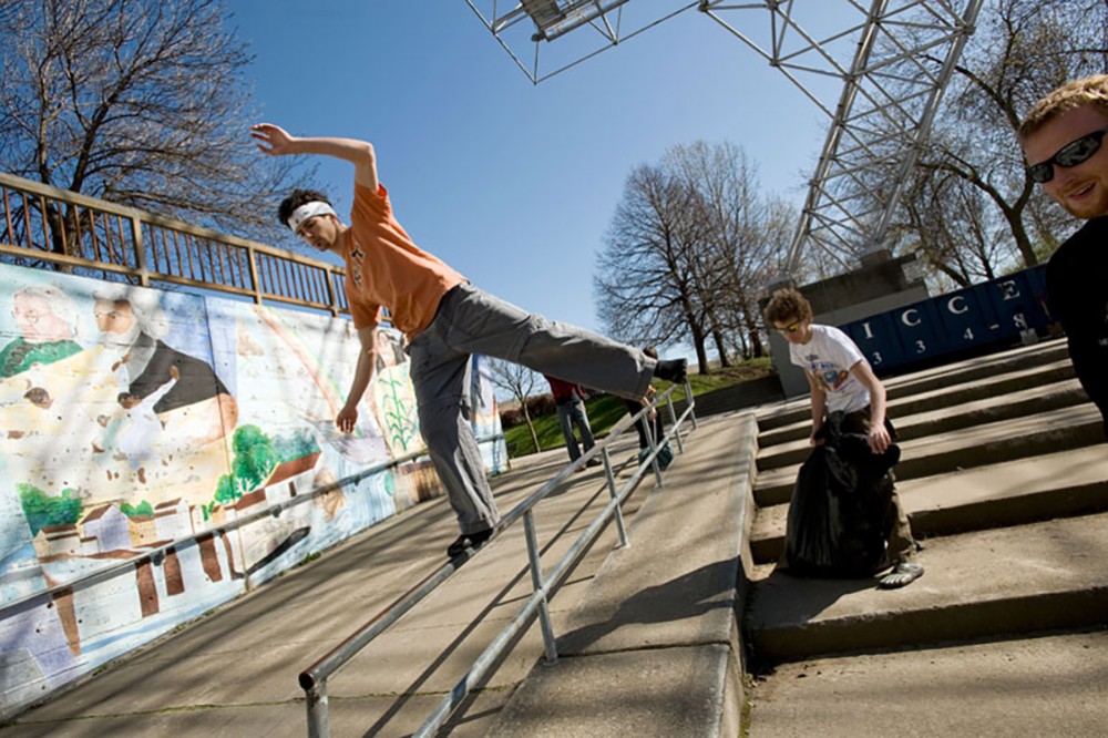 The Rochester Parkour group, which includes RIT alumni and students, cleaned up Manhattan Square Park on April 7. They meet on Saturdays in the park to practice their sport. Kyler Mulherin, a third-year game design student, has participated since he came to RIT. -