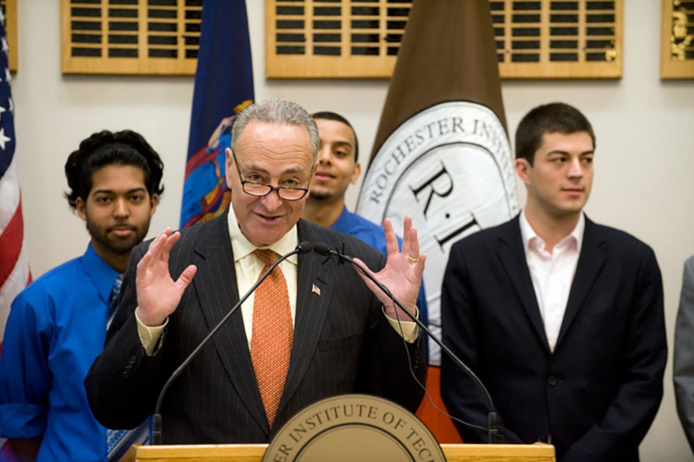 During a stop today at RIT, U.S. Sen. Charles Schumer announced his support for legislation to kill a rise in student-loan interest rates. On July 1, interest rates on federally subsidized Stafford loans will double from 3.4 percent to 6.8 percent, unless Congress takes action to block the increase. Joined by RIT President Bill Destler, Schumer addressed students from RIT and other area colleges in the Fireside Lounge. -
