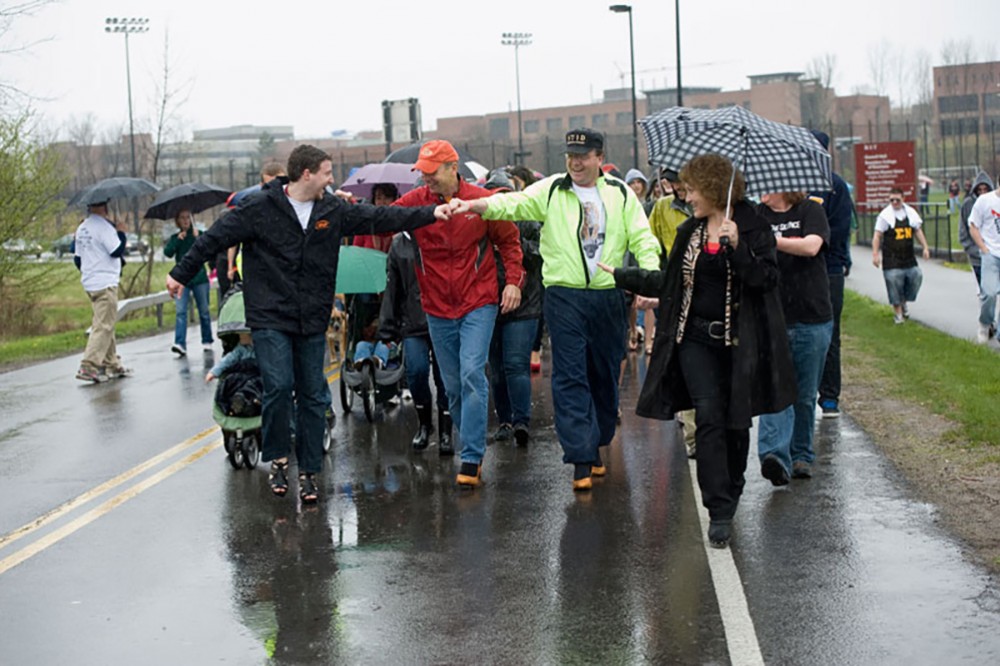 About 400 men and womenâsome wearing heelsâwalked a mile on April 15 to support victims of domestic violence. Alpha Sigma Alpha members coordinated the event. All proceeds went to the Advocacy Services for Abused Deaf Victims, a Rochester organization that provides free services to people who are deaf and hard-of-hearing and have experienced domestic violence or sexual abuse. NTID President Gerry Buckley, center, and Student Government President Greg Pollock share a fist-bump while making the trek. -