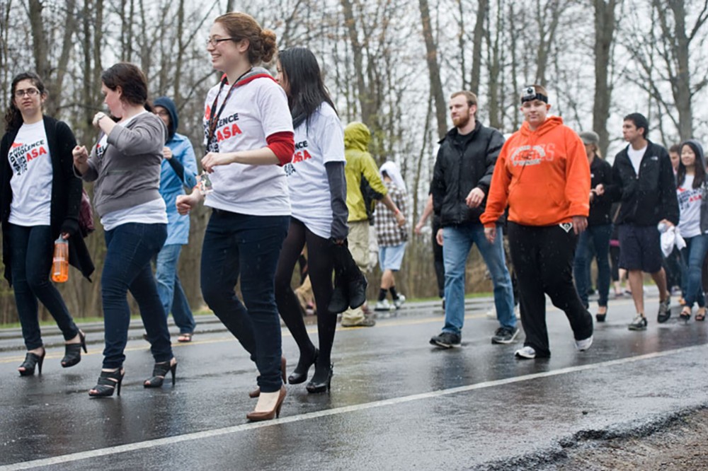 About 400 men and women walked a mile in heels on April 15 to support victims of domestic violence. Alpha Sigma Alpha members coordinated the event. All proceeds went to the Advocacy Services for Abused Deaf Victims, a Rochester organization that provides free services to people who are deaf and hard-of-hearing and have experienced domestic violence or sexual abuse. -
