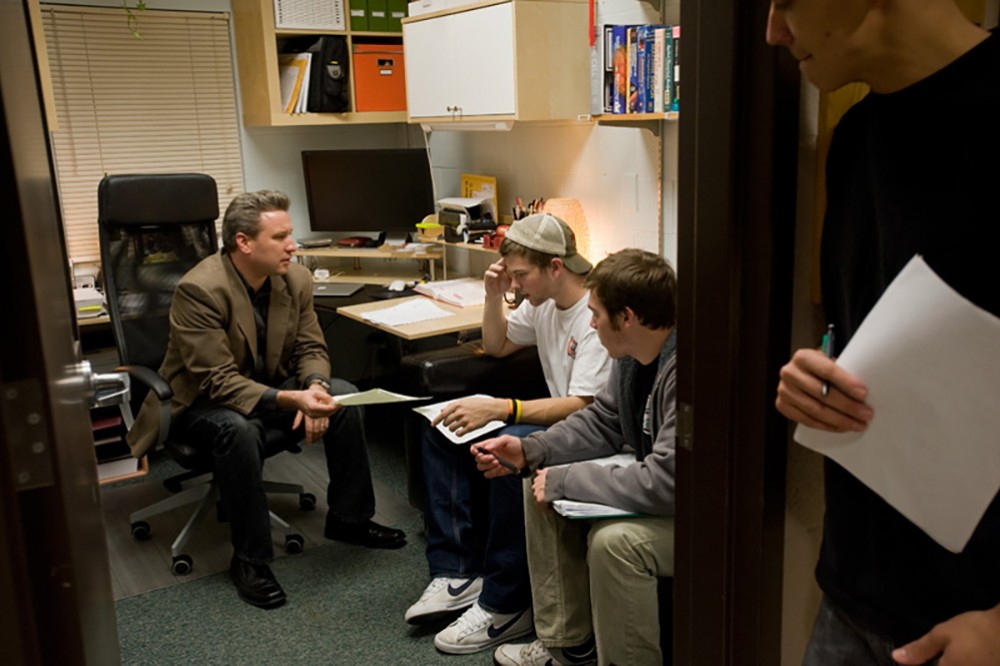 Teaching continues for engineering faculty Michael Schrlau, left, even after his Heat Transfer class has ended. Undergraduate mechanical engineering students gather at his office to discuss homework, class concepts and projects. Schrlau started his first year at RIT this past fall after working as a research assistant professor at Drexel University, where he developed devices for intracellular probing, imaging and spectroscopy. -