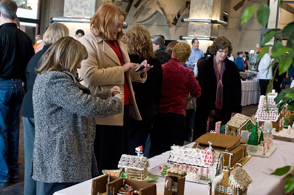 Attendees at the Finance and Administration holiday breakfast Dec. 19 admired and photographed the gingerbread houses on display. Each dining area created a gingerbread house for a competition this year. -