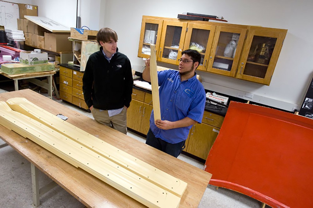 Josh Turner, left, technology director of Kosovo Wind Gardens, works on a mold for a turbine blade in RITâs composites lab. Turner is receiving assistance on the product from Rob Aldi, a graduate student in manufacturing and mechanical systems integration. Kosovo Wind Gardens is a venture that plans to construct and sell wind turbines to individual homes, businesses and farms in the vast rural areas of Kosovo. -