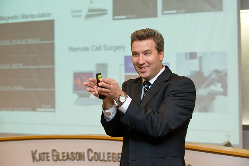 New faculty member Michael Schrlau joined the Kate Gleason College of Engineering this fall and has been working to balance classroom activities, research and department tasks. He talked to undergraduate engineering students about his research about unique strategies using nanotubes to study cells, tissue and larger biological systems. -
