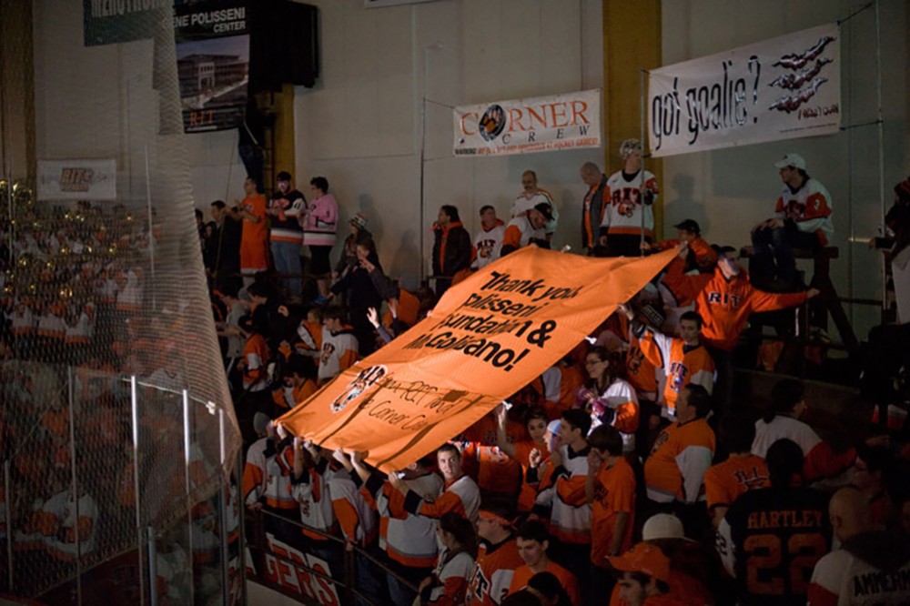 In a Nov. 11 announcement during the menâs hockey game, RIT President Bill Destler revealed that the universityâs future hockey arena will be known as the Gene Polisseni Center. The naming results from a $4.5 million partnership between the Polisseni Foundation and B. Thomas Golisano, founder and chairman of Paychex Inc. and an RIT trustee. Gene Polisseniâs widow, Wanda, and son Gary were on hand for the announcement at the RIT-Air Force game at Frank Ritter Arena.