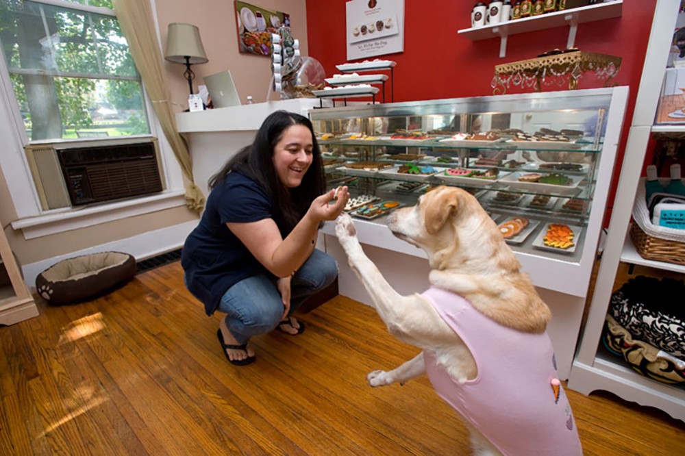 Gabriella Martinez â08 shows off her specialty dog treats to her Labrador, Andrea. For more information about her store at 30 North Ave. in Webster, go to www.abarkersdozen.com or read her story in RIT: The University Magazine. -