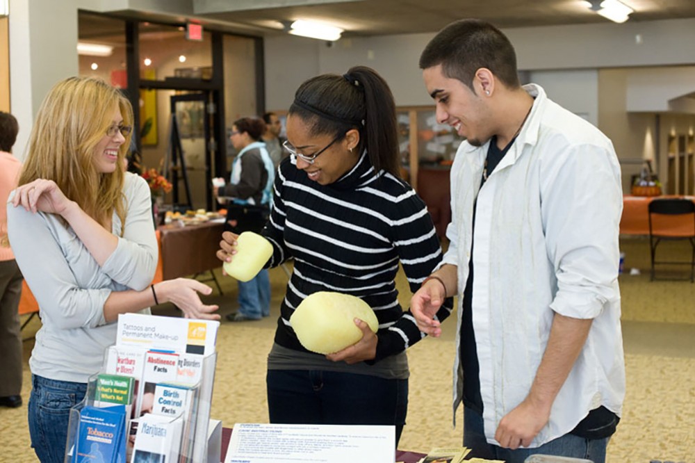 Students attending the Brick City Student Wellness Fair on Oct. 28 had a chance to talk to health-care professionals about diabetes, nutrition, dermatology, stress anxiety and other health concerns. From left, Jessica Douglas, Lachanda Mills and Carlos Castillo compare one and five pound blocks of simulated fat that were on display.