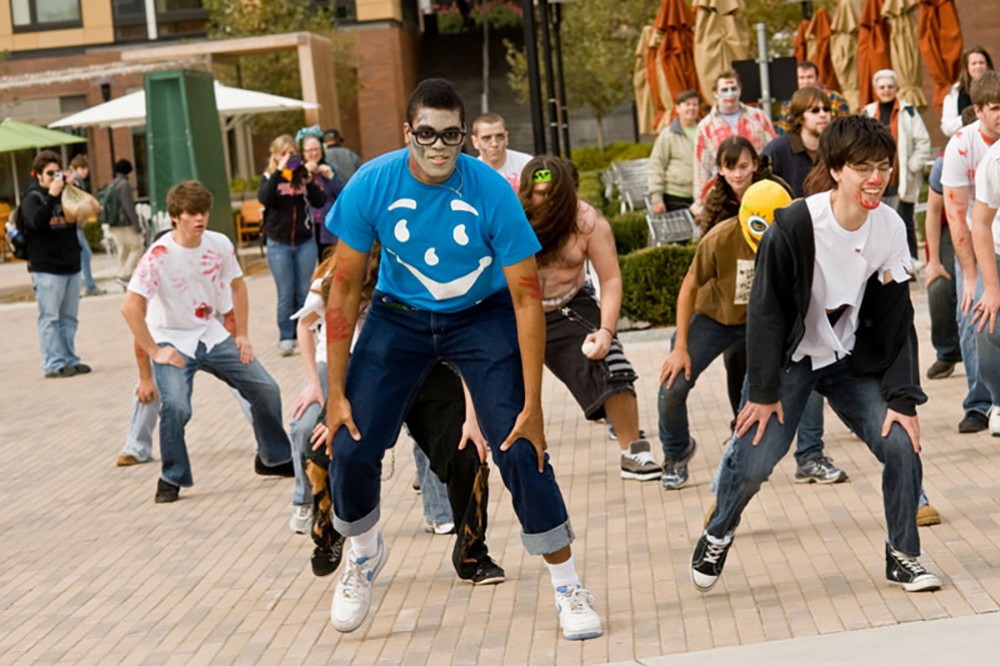 Members of the School of Interactive Games and Media organized a flash mob Oct. 31. The group danced to Michael Jacksonâs âThrillerâ in Global Village. The flash mob was organized as an achievement for the schoolâs recent launch of Just Press Play, an RIT and Microsoft-funded project that applies interactive game design to the college experience. -