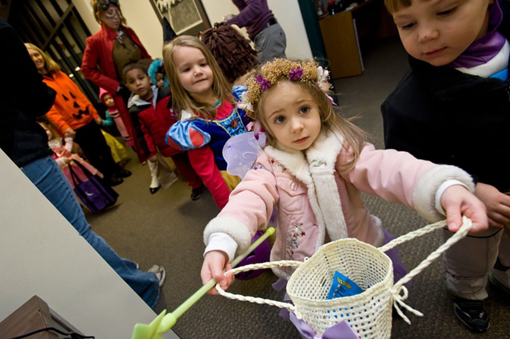 Costumed children from Care-A-Lot Child Care had their annual Halloween trek to Facilities Management Services, building 99, on Oct. 31. This group of 3-year-olds received treats at various candy stations, offices and the postal room. -