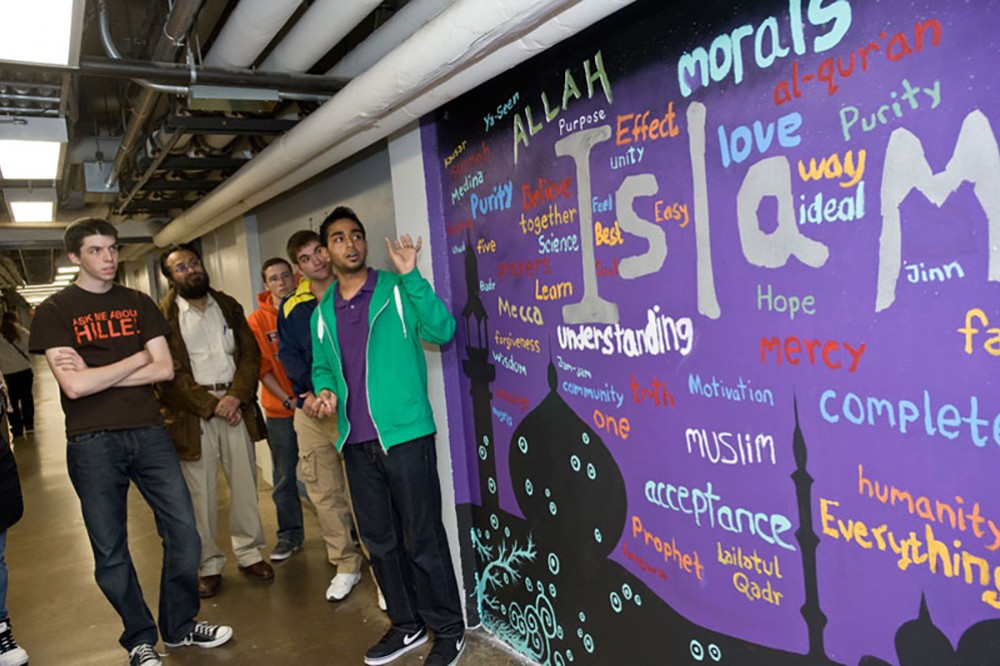 RITâs Muslim Student Association dedicated a new mural in the tunnels under the residence halls on Nov. 3. The mural signifies Muslim tradition, belief and values, says Yilmaz Yoruk, a biomedical sciences major and member of the association. The Muslim mural joins scores of other murals in the RIT tunnels. To learn more about the tunnel murals at RIT, go to Tunnels tell stories of the times and photo gallery of murals. -