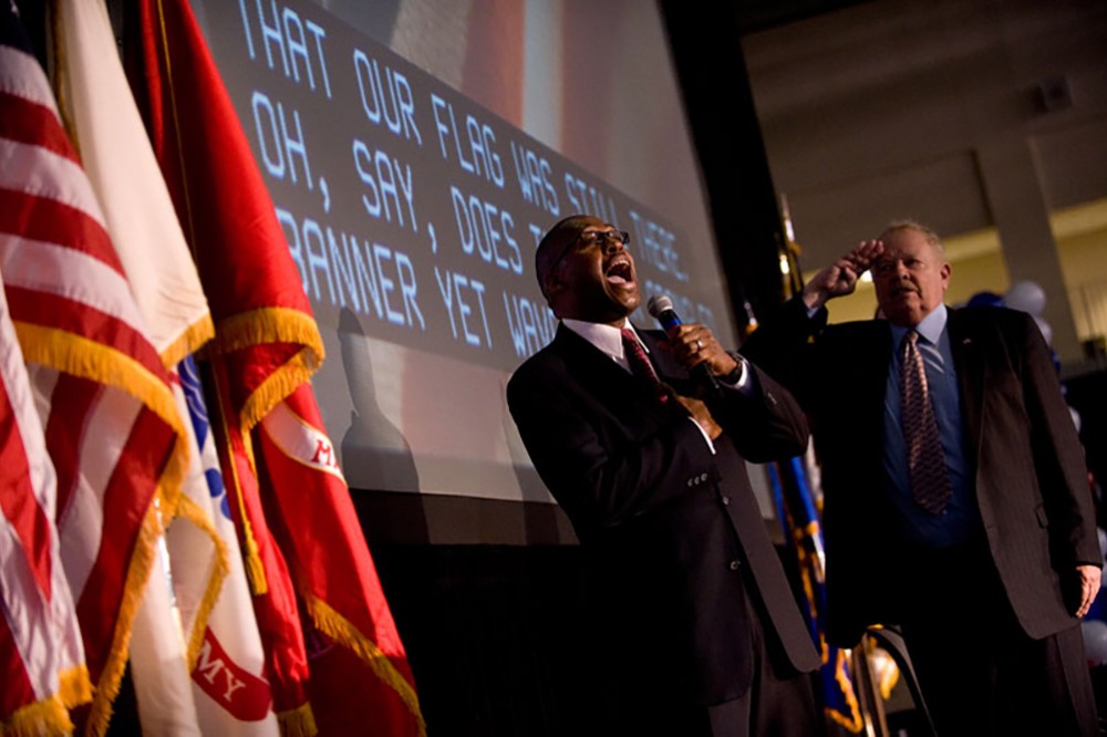 On Veterans Day, Nov. 11, RIT hosted its inaugural Veterans Day Recognition and Celebration. The breakfast event paid tribute to members of the campus community who serve or have served honorably in uniform. RIT boasts a long history of accommodating the educational needs of returning veterans, dating back to the end of World War II. Event organizers say creating an annual on-campus event to accompany the national observance of Veterans Day is another way to acknowledge the service of all veterans affiliated with RIT. Keith Jenkins, associate professor in the Department of Communication, sings the national anthem as Barry Culhane, executive assistant to the president, salutes. -