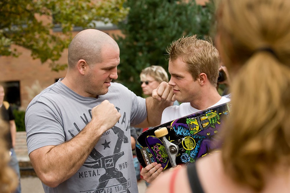 RIT/NTID alumnus Matt Hamill, NCAA wrestling champ and former Ultimate Fighting Championship contender, took over the Frisina Quad on campus and enlisted student talent to film a music video in collaboration with Sean Forbes (not pictured), who has gained fame as a hip hop artist since graduating from RIT/NTID. The release of the music video coincides with the premiere of The Hammer, a movie about Hamillâs life. The movie, which was filmed in part on the RIT campus, opens Oct. 27 in select theaters nationwide.