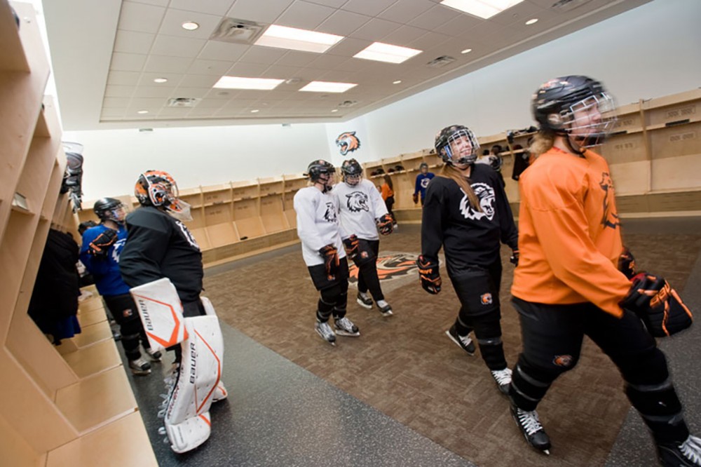 Members of the RIT womenâs hockey team walk out of their new, state-of-the-art locker room before a recent practice. The one-story, 12,000-square-foot locker room addition is located on the east side of the current 52,125-square-foot arena. It houses the new menâs and womenâs hockey locker rooms, coachesâ facilities, treatment space, equipment storage. -