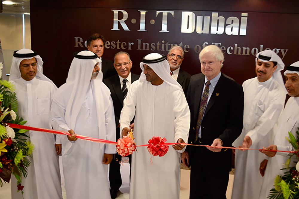 As part of his recent trip to RIT international campuses in Croatia and the United Arab Emirates, President Bill Destler visited RIT Dubai for a new campus dedication ceremony on Oct. 24. He was joined by Sheikh Nahyan bin Mubarak al Nahyan (second from left), the Dubai minister of higher education and scientific research; Sheikh Ahmed bin Saeed al Maktoum (center), chairman of Dubai Silicon Oasis; and other dignitaries. âThe seeds of RIT Dubaiâs success have been planted and are now being carefully nurtured by this outstanding group of leaders,â Destler remarked. -
