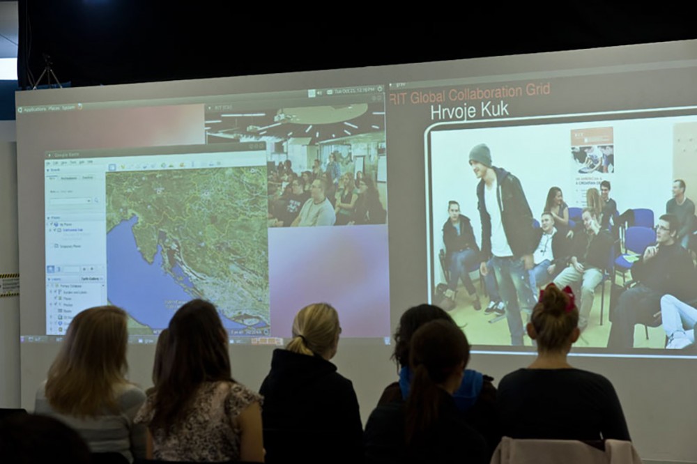 Thanks to videoconferencing, students from RITâs main campus and the American College of Management and Technology campus in Zagreb, Croatia, were able to connect with each other and share their first-year experiences. The students spoke about the similarities and differences among the schools and their various cultures. This was part of Maureen Barryâs Interpreting Discovery class held Oct. 25 in the Center for Student Innovation. -