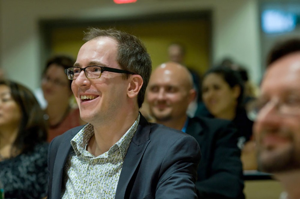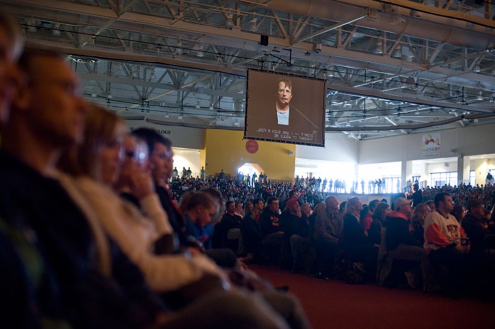Donald Brinkman, research project manager for Microsoft Research Connections, thanks members of RITâs Just Press Play project team and the School of Interactive Games and Media for their work. Brinkman visited RIT for the launch of Just Press Play on Oct. 13 in the B. Thomas Golisano College of Computing and Information Sciences. Just Press Play is an interactive video game that helps students explore, uncover secrets, band together and seek a balance in their academic and social livesâall of which help to make a student âawesome.â RIT faculty, staff and students developed the game and it was funded by a $350,000 gift from Microsoft Research. -