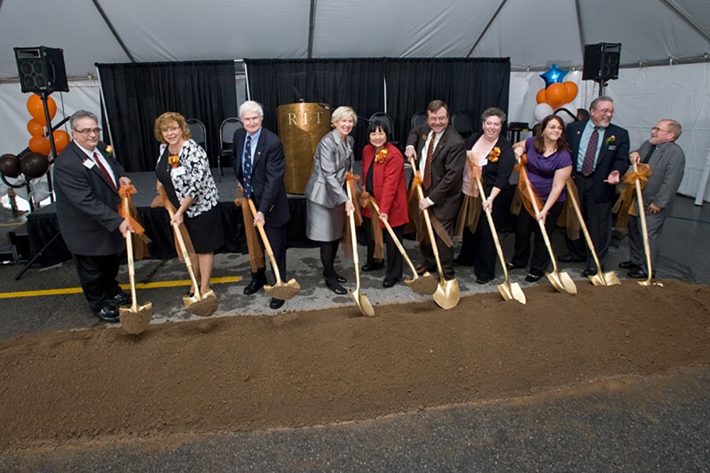 Members of the William G. McGowan Charitable Fund join RIT President Bill Destler, NTID President Gerry Buckley and other dignitaries for the ceremonial groundbreaking of Sebastian and Lenore Rosica Hall on Oct. 14. The $8 million, 23,000-square-foot building is intended for research and innovation at NTID. The building is expected to be completed in the spring of 2013. -