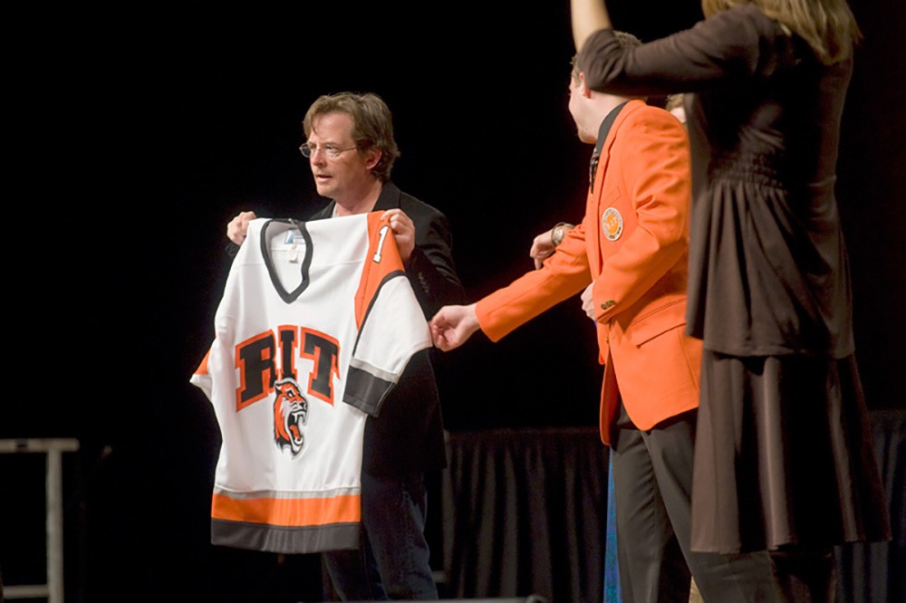 RIT presented actor, director and author Michael J. Fox with a hockey jersey at the conclusion of his talk as the Brick City Homecoming & Family Weekendâs Horton Distinguished Speaker. Fox spoke to a sell-out crowd Oct. 15 in the Gordon Field House and Activities Center. He starred in the TV series Family Ties and Spin City, as well as the Back to the Future trilogy, Teen Wolf and The American President. Diagnosed with Parkinsonâs disease in 1991 at the age of 29, Fox has also become an advocate for increased research funding and awareness for Parkinsonâs disease through The Michael J. Fox Foundation for Parkinsonâs Research. The jersey gift was fitting, as Fox played hockey growing up in Canada. -