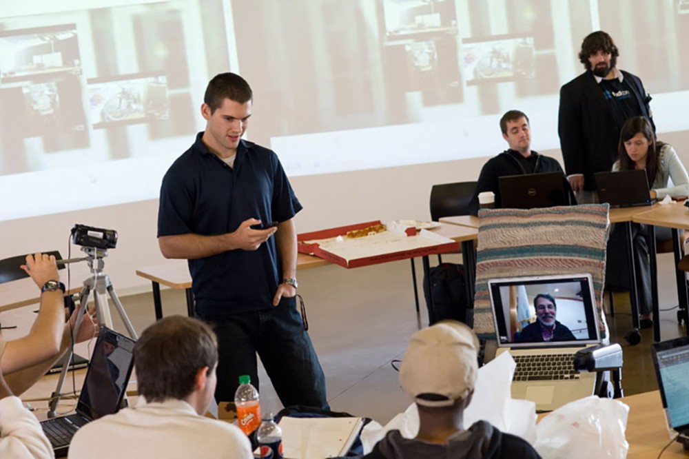 A remote-controlled wheelchair developed by RIT students David Olney and Luticha Doucette transformed into a telepresence robot in the Center for Student Innovation on Oct. 7. A laptop attached to the wheelchair provided an audience at MITRE Corp.âs headquarters in Bedford, Mass., with a virtual tour of the center. The centerâs director, Jon Schull, spoke at MITREâs Innovation Brown Bag Lunch Series about the facility and the innovative, collaborative work among RIT students and faculty. As Schull spoke, students at RIT guided the robot around the center to give MITRE researchers a chance to visit the center, the new Rapid Prototyping lab, and the students. -