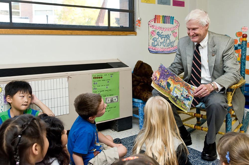 President Bill Destler reads to the children at RITâs Margaretâs House on Oct 11. The kindergarten class is participating in a national program sponsored by Pizza Hut, called âRead Along for Hunger.â The class has a goal to read 300 books. Margaretâs House provides full day care and education for children ages 8 weeks through kindergarten and after-school care for first- through third-grade children. -