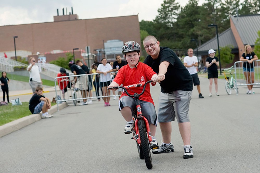 RIT students were among dozens of community volunteers who volunteered during Lose the Training Wheels, hosted by the Gordon Field House and Activities Center Aug. 8-12. The camp helps kids with autism learn how to ride a conventional bike without training wheels, which organizers say builds self-confidence and provides inclusion with peers. UNYFEAT, an organization that supports individuals with Autism Spectrum Disorder and their families, sponsored the event. Here, Will Schlindler, an eight-year-old from Pittsford, gets support from Kris Spencer, a third-year interpreting student at NTID. -