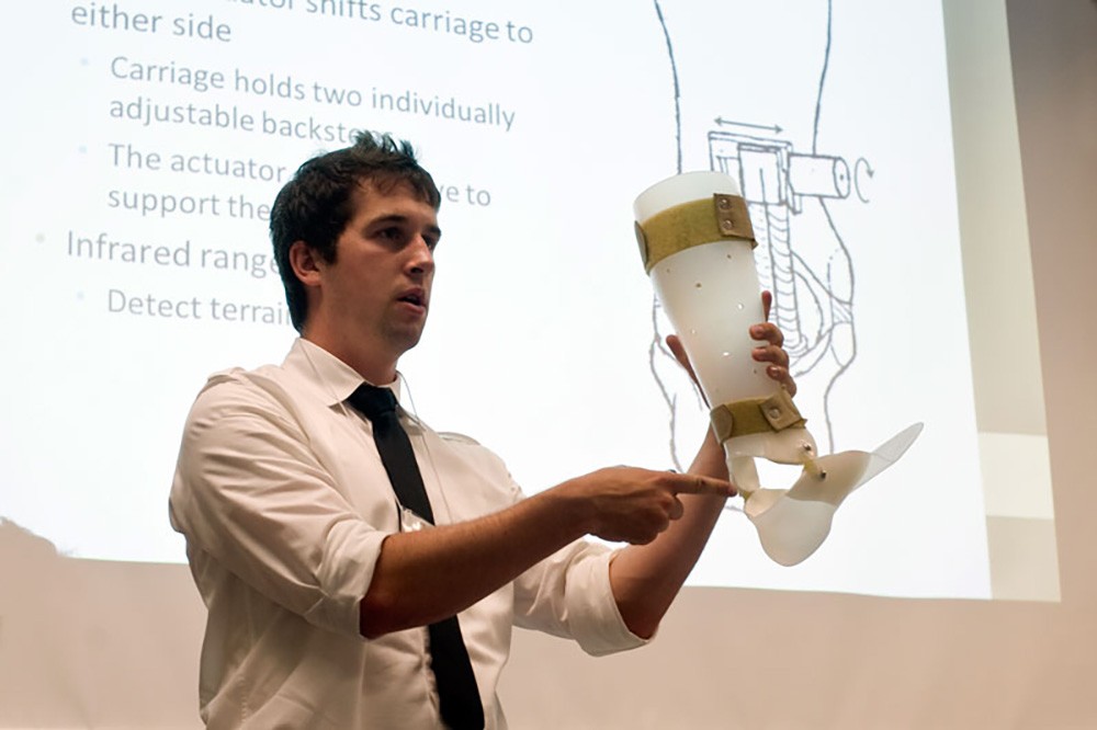 Christopher Sullivan, a mechanical engineering major, was among the more than 200 RIT students who participated in the annual Student Research and Innovation Symposium on Aug. 12. Sullivan presented his preliminary design of an ankle foot orthotic that adapts to differing terrain. Student researchers and innovators presented their work throughout the day at Louise Slaughter Hall and the Center for Student Innovation. -