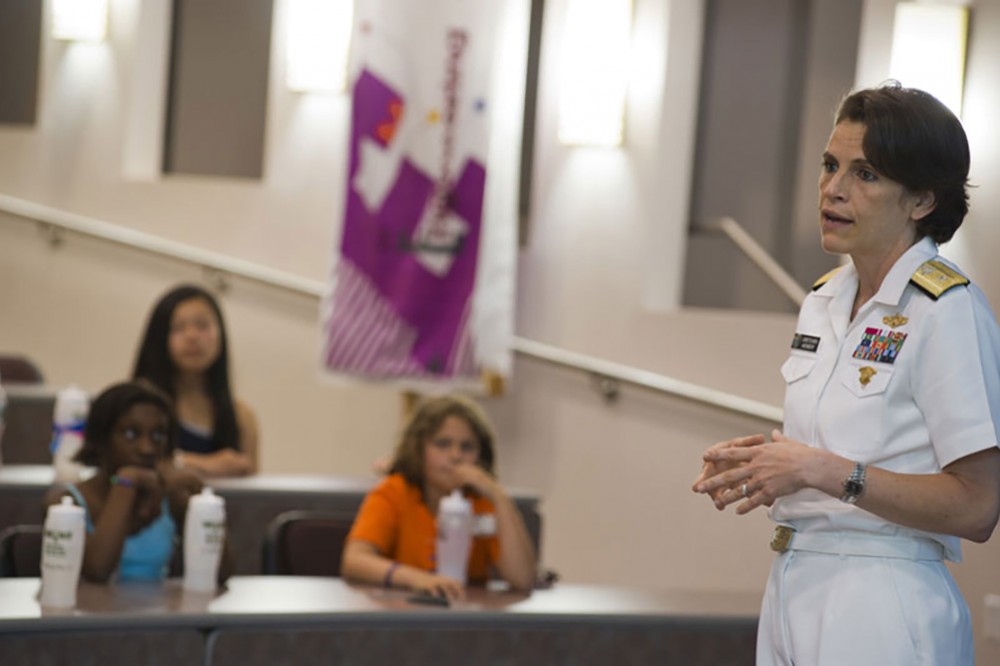 While the U.S. Navy Blue Angels flew overhead, several of the Navyâs flag officers and enlisted personnel stopped by RIT to visit with middle school girls in the WE@RIT World in Motion camp to talk about how STEM programs can be preparation for naval careers. Featured at the camp event was Rear Admiral Gretchen Herbert, assistant chief of naval operations, who shared some of her experiences as she first looked into the Navy as a career choice while attending West Irondequoit High School. Since being commissioned in 1984, Admiral Herbert has served as a combat systems officer and assistant chief of staff for communications and information systems and has been deployed in the Mediterranean and Arabian Gulf with several carrier strike groups.