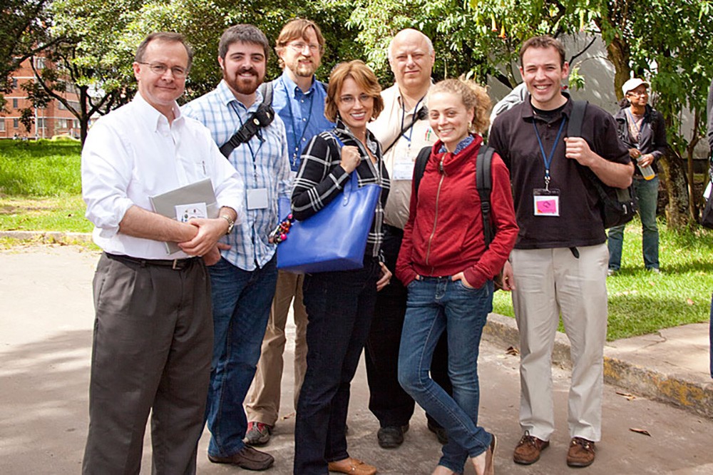 RIT professor Grover Swartzlander, left, shared his expertise in optical vortices with graduate students and other young scientists during the Pan-American Advanced Studies Institute on Frontiers in Imaging Science in June at Universidad Nacional de Colombia in Bogatá Colombia. Standing with Swartzlander are Matt Risi, alumnus; Ross Robinson, graduate student in imaging science; Meridith Whitaker-Kupinski, alumna; David Saroff, doctoral student in the astrophysical sciences and technology program; and Alexandra Artusio Glimpse and Kenny Fourspring, graduate students in imaging science. Swartzlander is an associate professor in RITâs Department of Physics and the Chester F. Carlson Center for Imaging Science. -