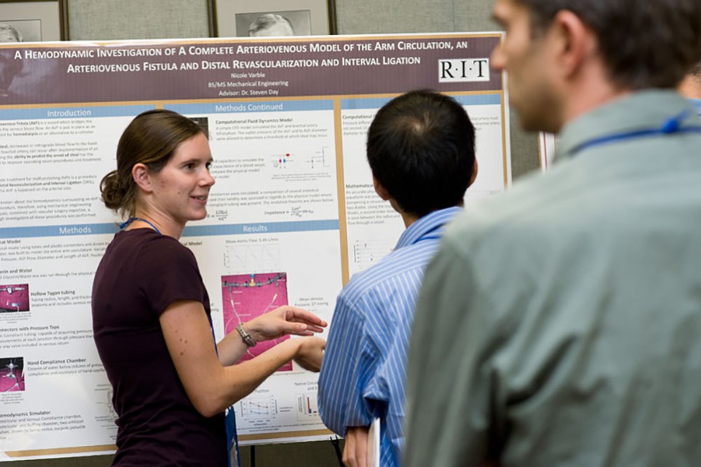 More than 100 RIT graduate students presented their research at the third annual Graduate Research Symposium on July 22. Nicole Varble, a mechanical engineering student, explained her research on methods to increase flow in a fistula used for dialysis. -