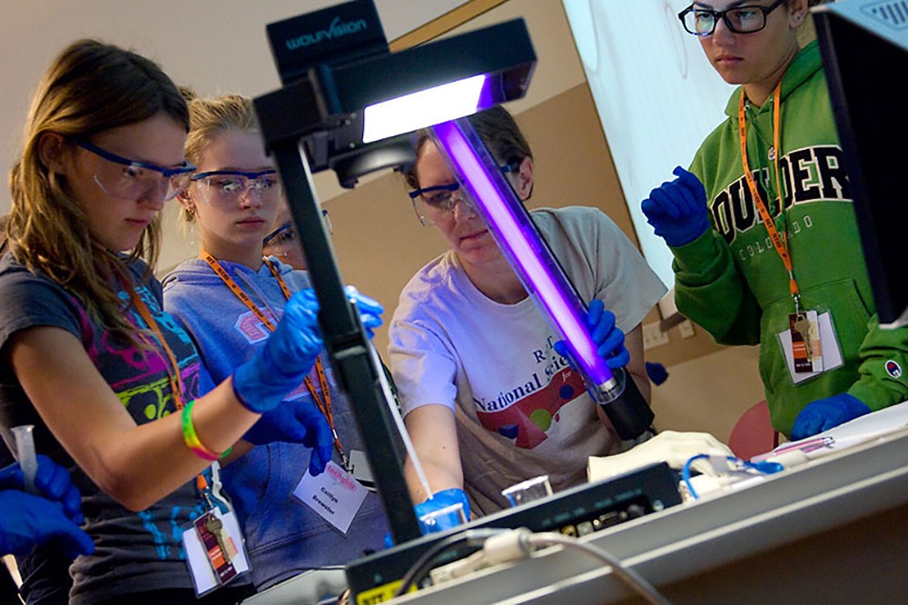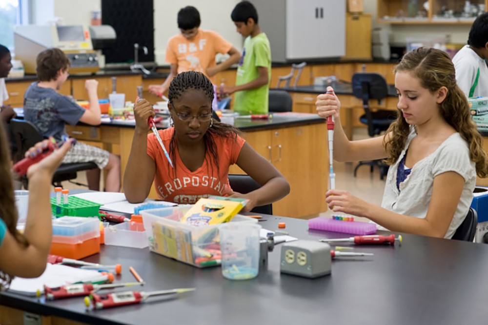 Kayjona Rogers, left, and Carina Scalice, from Penfield, practice using the pipette during the DNA Detectives camp, July 25-29, offered as part of RITâs Center for Bioscience Education and Technology bioscience exploration summer program. Twelve students from area middle schools learned about their personal genetics and how DNA is used to solve crimes. Dina Newman, assistant professor in biological sciences, presented the campers with a mystery involving RITâs mascot RITchie, which they had to unravel using DNA clues. -