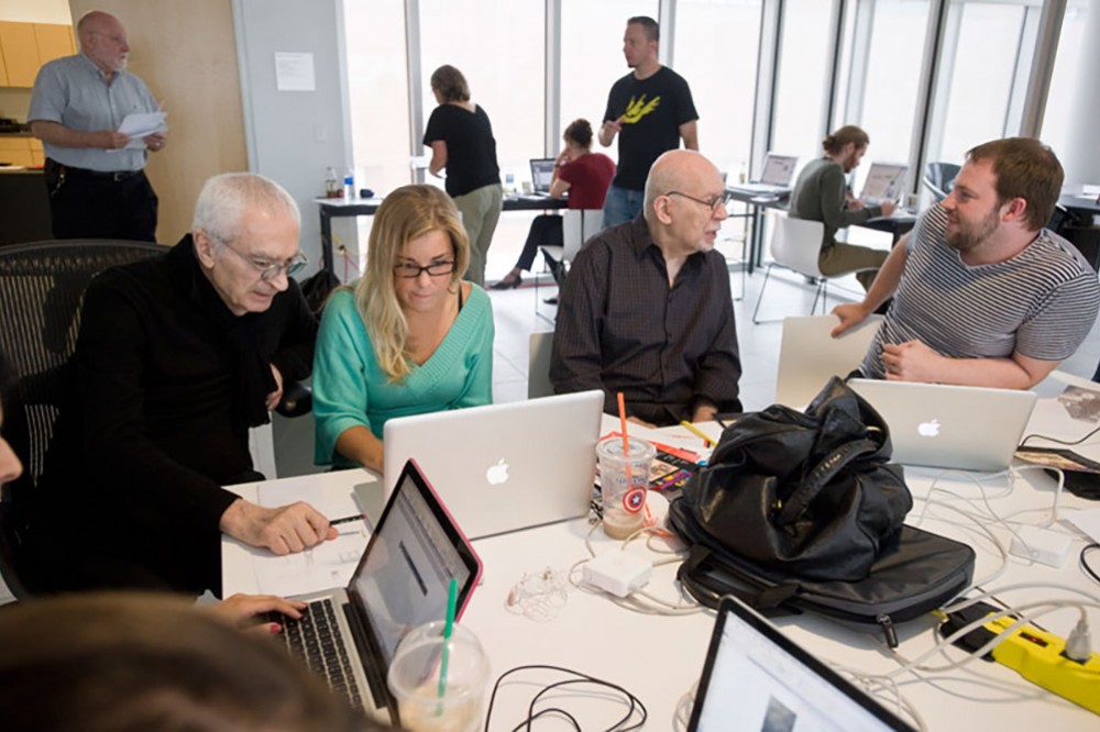 Renowned designers Massimo Vignelli, left, and George Lois, second from right, hosted a master designerâs workshop in July in RITâs Vignelli Center for Design Studies. Participants from all over the country were part of a hands-on weeklong workshop working with the pioneers. Loisâ iconic Esquire covers that he designed for the magazine from 1962 to 1972 are on exhibit in the University Gallery, adjacent to the Vignelli Center. -