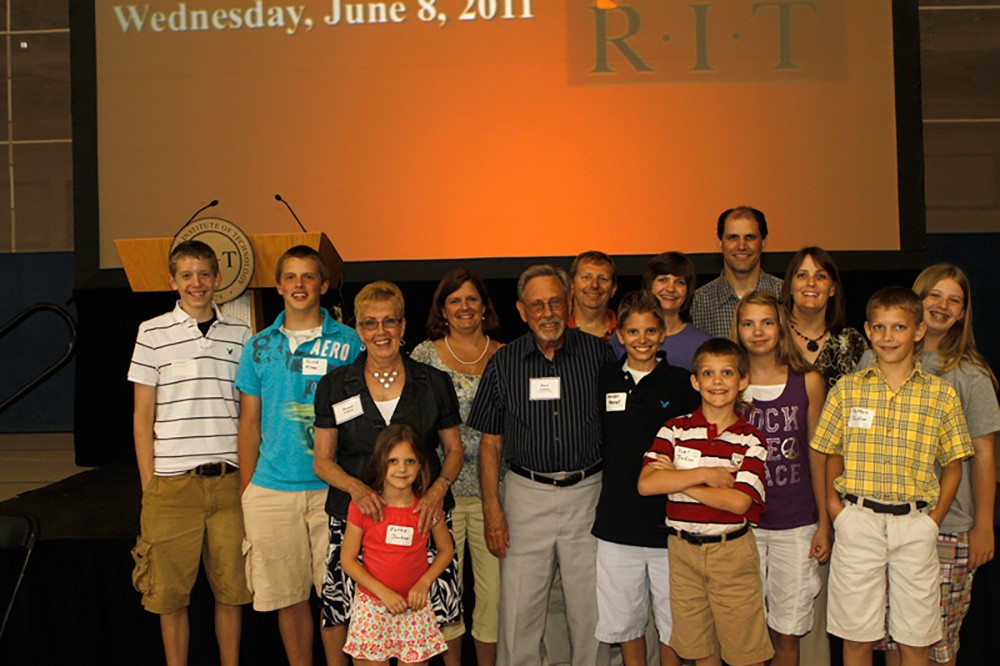 The 13th Annual RITirees Picnic took place in the Gordon Field House and Activities Center on June 8. Two retirees, Stan Witmeyer and Dave Calman, received the RITirees Award. Here, Calman, center, gathers his family for a group photo.