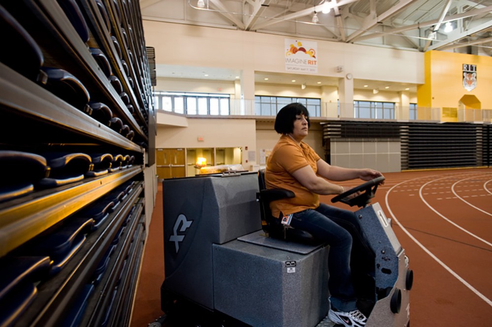 Nereida Vargas is among nearly 250 RIT staff members who make up Facilities Management Services. With 5 million square feet of building space on campus, nearly half of the FMS team is devoted to custodial services. Vargas, senior custodian, operates a floor cleaner in the Gordon Field House and Activities Center. -