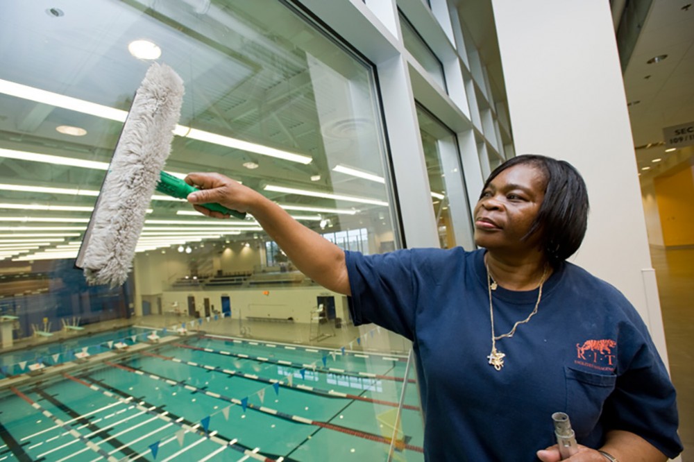 Beverly Gough is among nearly 250 RIT staff members who make up Facilities Management Services. With 5 million square feet of building space on campus, nearly half of the FMS team is devoted to custodial services. Gough works in the Gordon Field House and Activities Center. -