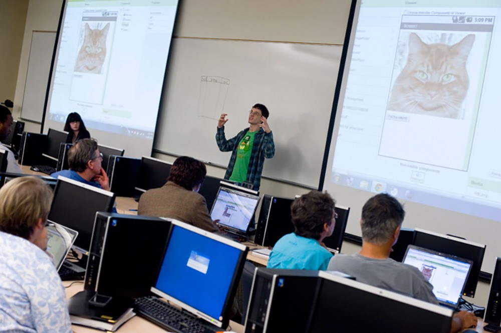 High school teachers attending RITâs Summer Math Institute Teachersâ Workshop had the opportunity to attend computer science presentations offered through the CS4HS workshop. Both programs ran June 27-30. Here, Alex Canter leads the App Inventor Workshop, along with Lindsey Ellis (seated to his right). -