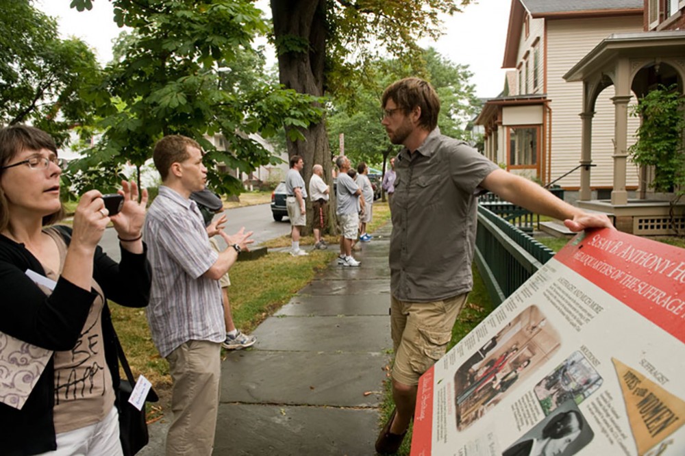 RIT history professor Richard Newman, center, makes a stop at the historic home of Susan B. Anthony during his conference, âAbolitionism, Womenâs Rights and Religion on the Rochester Reform Trail,â which continues through July 23. Eighty schoolteachers from around the country came to Rochester to learn about our place in American history. Other tour stops include Mount Hope Cemetery, National Womenâs Hall of Fame in Seneca Falls, the Erie Canal Aqueduct and The Strong. Newman discusses the tour with Kevin Brenner, right, a teacher in Greensboro, N.C., and a Rochester native. -