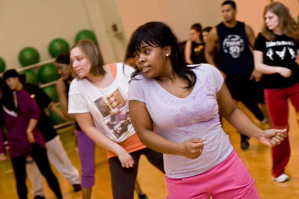 RIT faculty, staff and students enrolled in Brandy Morrisonâs hip-hop fitness class perfect their routine. The class is just one of the unique fitness courses offered through RITâs Center for Intercollegiate Athletics and Recreation.