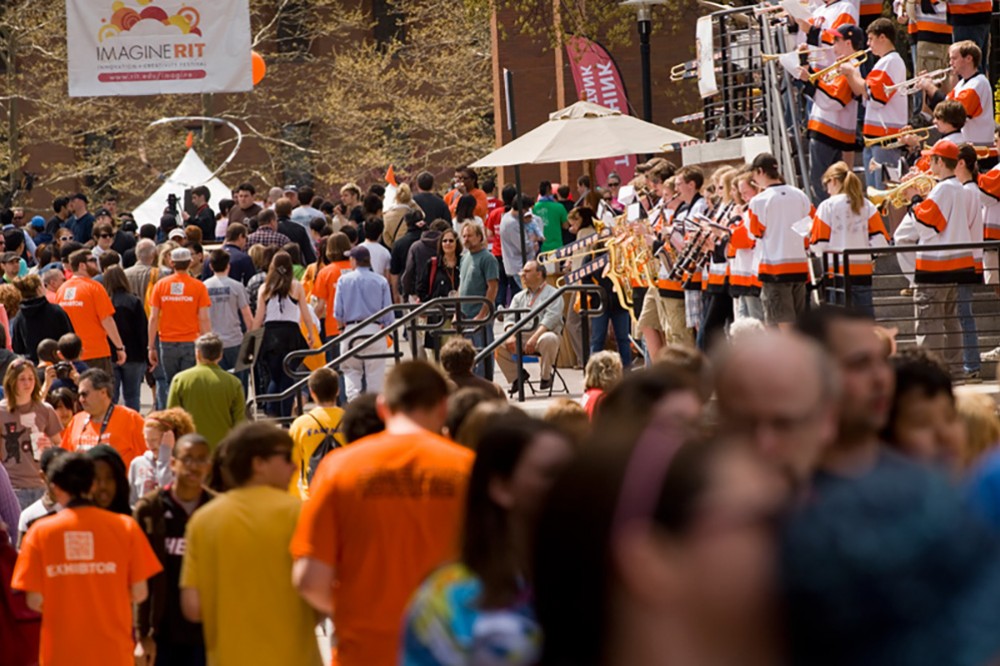 The RIT Pep Band performed a selection of songs on the Eastman Kodak Quad steps during the 2011 Imagine RIT: Innovation and Creativity Festival on May 7. Approximately 32,000 visitors explored 350 exhibits showcasing technology and creativity. -