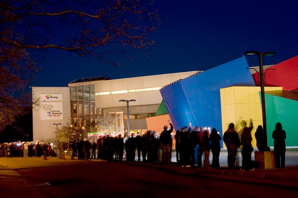 The Strongâs National Museum of Play was the subject of the 2011 RIT Big Shot on May 5. Close to a thousand volunteers, manned with flashlights, illuminated The Strongâs campus while RIT photographers shot an extended exposure from the terrace rooftop of the ESL Federal Credit Union on Chestnut Street. -