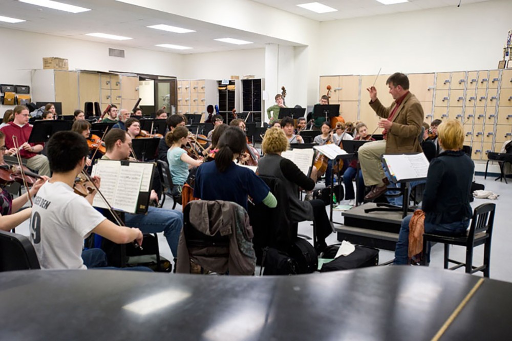 Members of the RIT Orchestra rehearse for the spring concert, âFive Centuries of Italian Music,â to be held April 30 in Ingle Auditorium. The orchestra will perform great Italian music from the 16th through the 20th centuries, including works by Monteverdi, Vivaldi, Donizetti, Rossini and Verdi. Students from all majors participate in the orchestra.